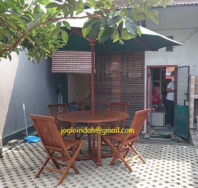 Meja payung taman yang dipesan dipasang halaman yang terletak dibelakang deretan kios yang menjual berbagai sajian kuliner didaerah Jombang,Ciputat Tangerang Selatan.Di fungsikan sebagai pilihan tempat duduk luar ruang untuk para pengunjung yang dalam menikmati sajian.Siapapun yang duduk di meja payung taman tersebut akan merasakan sejuknya udara karena adanya berbagai macam tumbuhan yang ada.