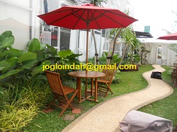 Meja payung taman yang terpasang taman kantor pemasaran tersebut merupakan salah satu tempat favorit calon pembeli unit apartemen,karena disana calon pembeli bisa mendapatkan informasi yang jelas tentang unit yang ada sambil duduk santai di meja payung taman.
