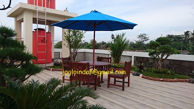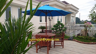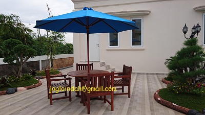 Setelah sebelumnya mengadakan pembelian 2 unit kursi kolam renang beserta payung parasolnya untuk didek kolam renangnya,kali ini rumah baru yang terletak dikawasan Pasir Balaraja ini mengadakan pembelian barang lagi kepada Joglo Indah Furniture berupa set meja payung taman dengan kursi kebun.Set meja payung taman ini oleh peilik rumah minta agar dipasang ditaman yang terletak disamping kanan dari kolam renang rumah tersebut dan juga dengan warna kain payung yang sama dengan yang berada dikolam renang.