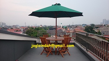 Dipasang didak lantai 4 dari tempat kos tersebut,diharapkan set meja payung taman menjadikan tempat yang nyaman untuk para penghuni kos bersantai selepas menjalani berbagai rutinitas mereka ditempat kerja.Juga bisa dijadikan tempat mengobrol,mengadakan berbagi acara dengan sesama penghuni tempat kos sehingga terjalin keakraban diantara mereka.